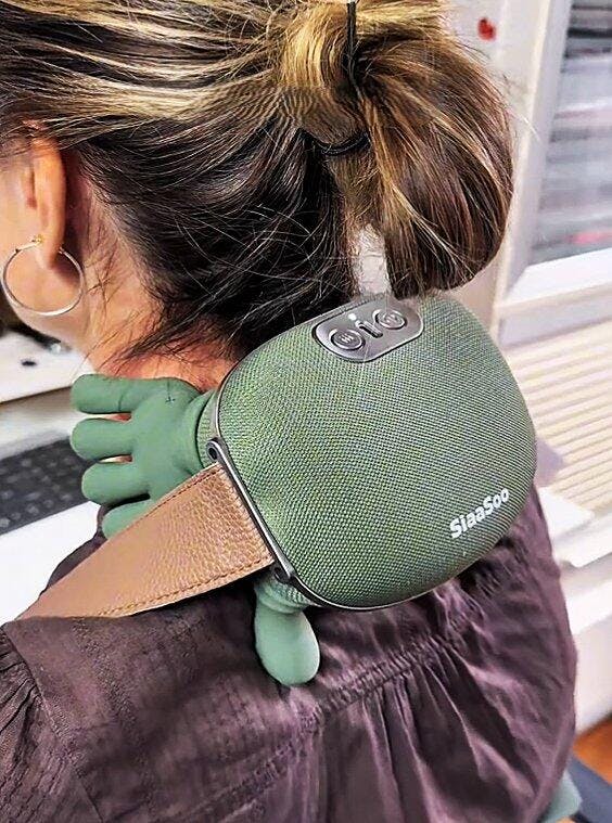 The Fusion Neck Massager feels like real hands giving you a massage. It helps take away pain and tightness so you can feel calm and happy again.